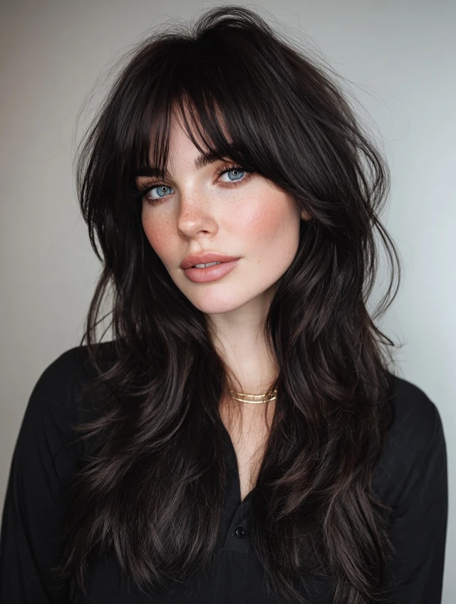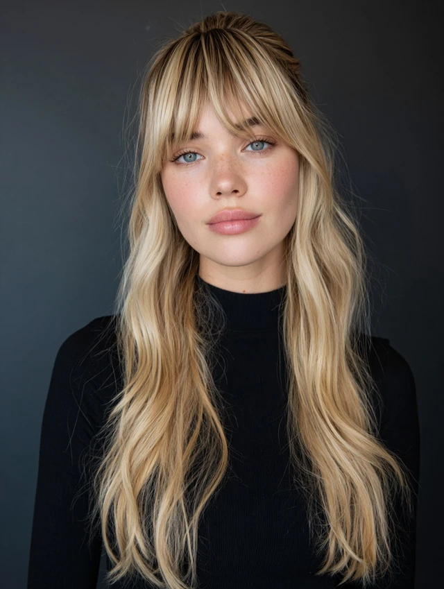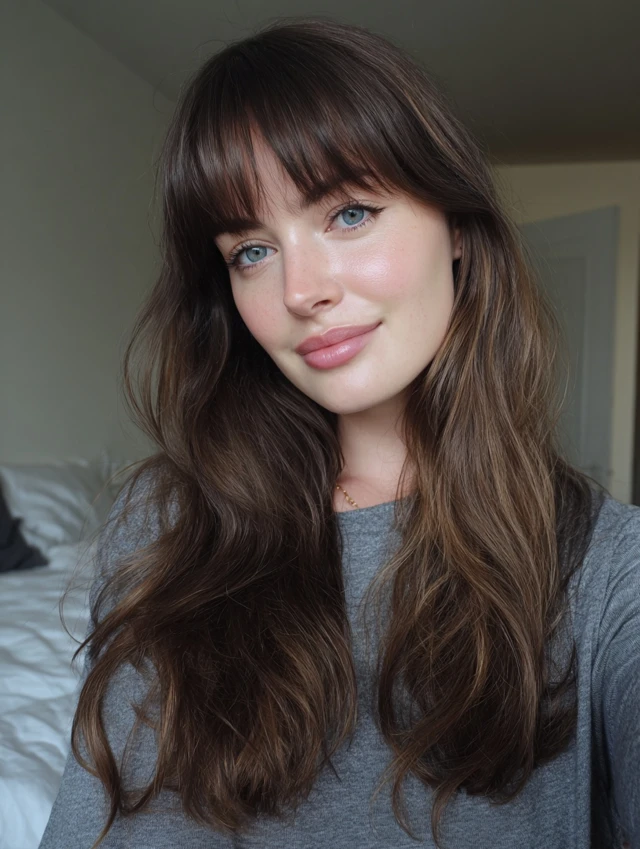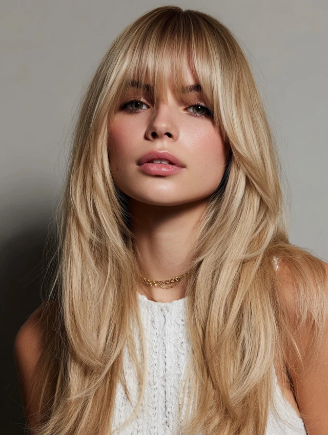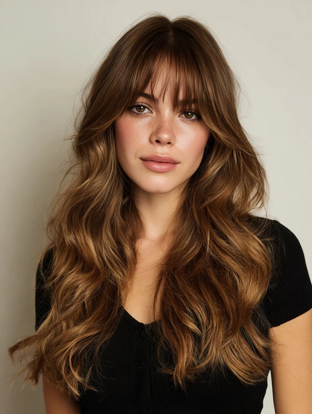Soft, balanced bangs frame the face while blending into the rest of the hair.