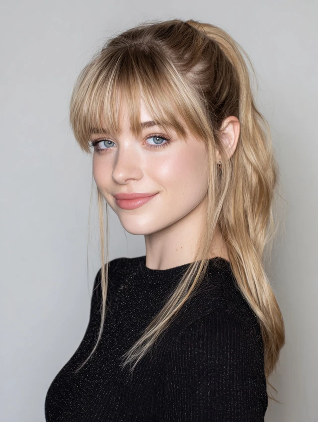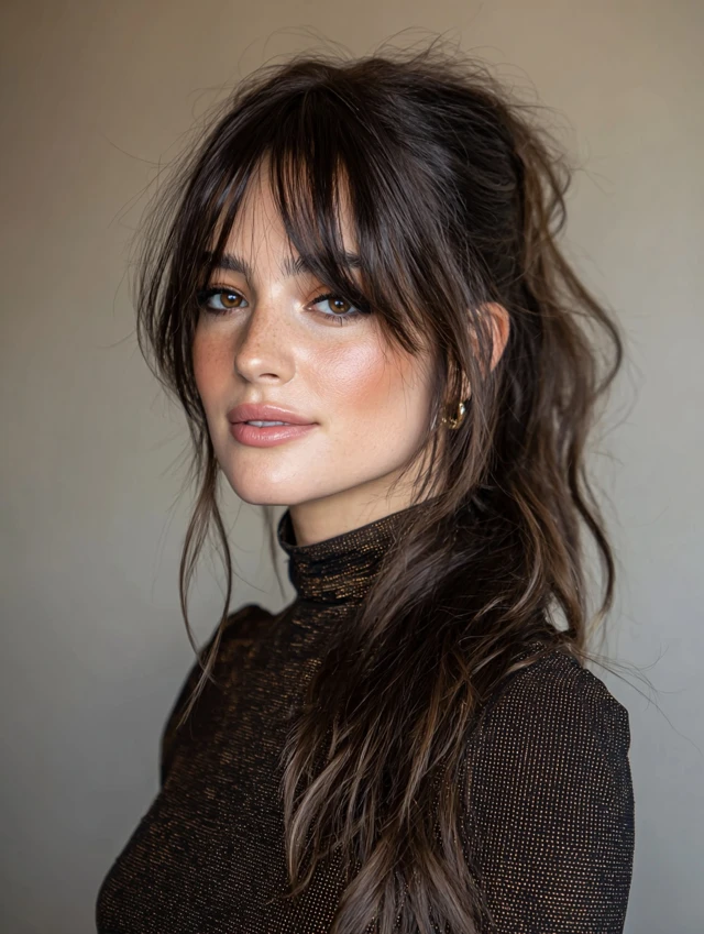 The bangs add softness to pulled-back styles, preventing a harsh look.