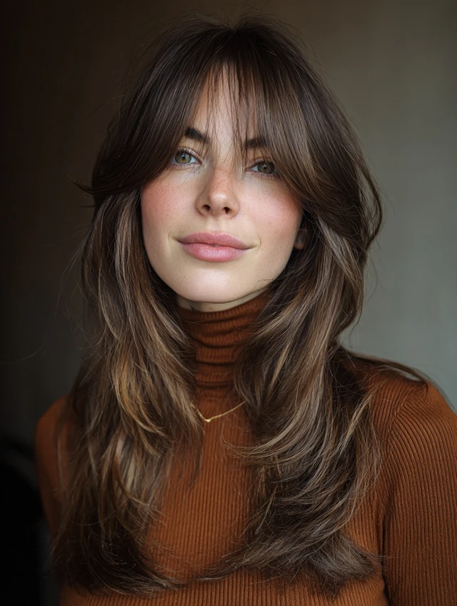 Soft, layered bangs parted down the middle with blended edges.