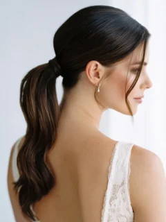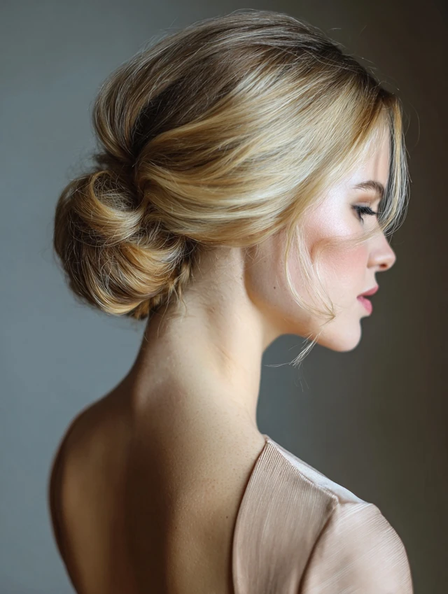 A sleek low bun at the nape of the neck creates a timeless and polished look.