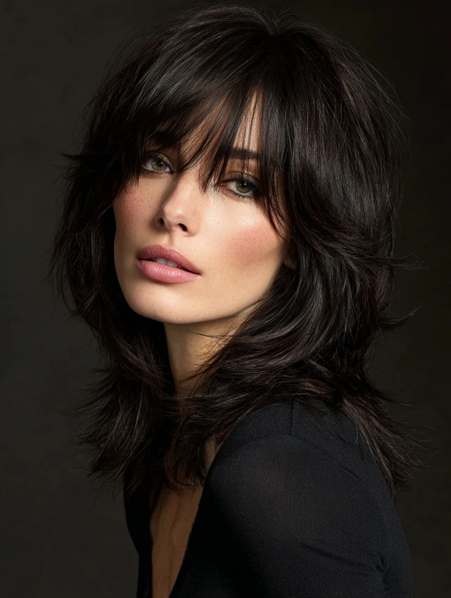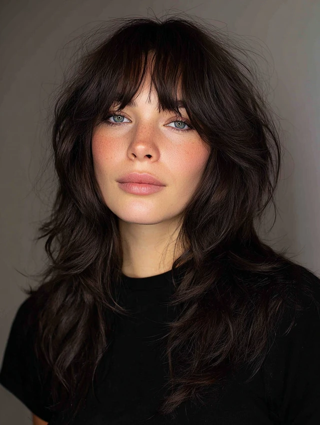 Curtain bangs blend perfectly with layers, framing the face beautifully.